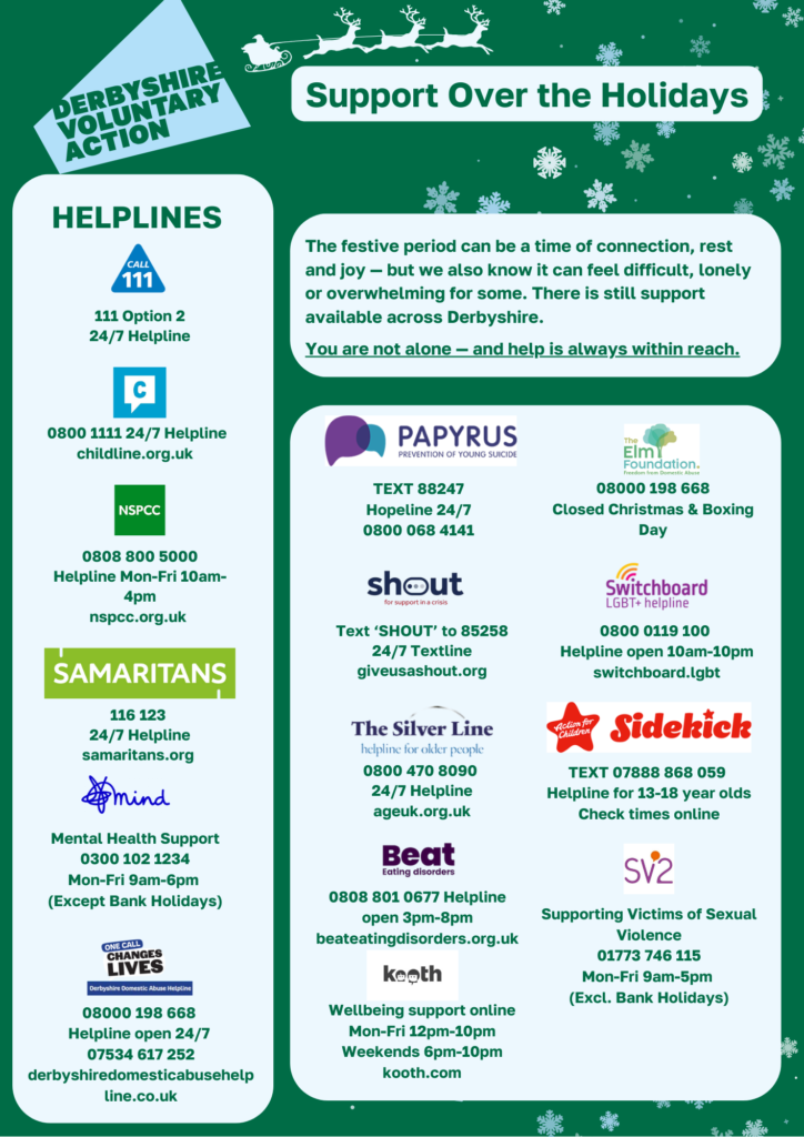 The festive period can be a time of warmth, celebration and togetherness — but for many people it can also feel isolating, overwhelming, or difficult. At Derbyshire Voluntary Action (DVA), we want people across Derbyshire to know that support is still available over the holidays.